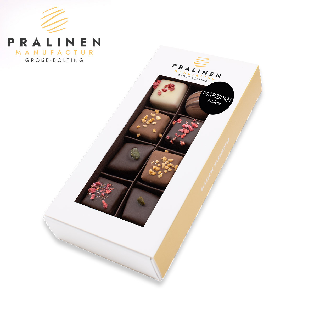 Freuen Sie sich auf unser fruchtiges Himbeer-Marzipan umhüllt von weißer und feinherber Schokolade, Pistazien-Marzipan, Hattrick und Prinzess Pralinen.