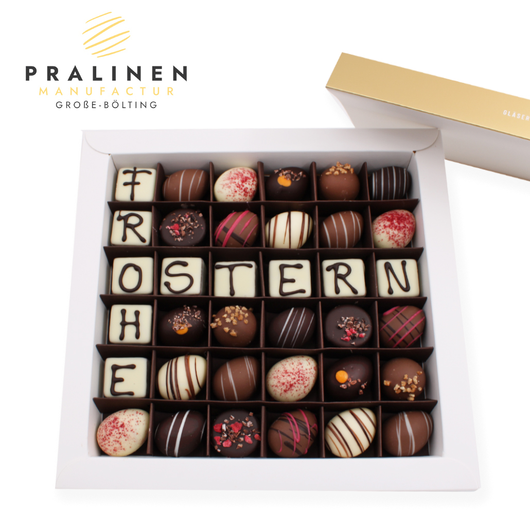 36 Pralinen sind in dieser leckeren Pralinenbox. Perfekt als Oster Geschenk für Erwachsene. Mit Buchstabenpralinen haben wir die Botschaft Frohe Ostern platziert. Übergeben Sie dieses Oster Geschenk persönlich oder lassen Sie es an einen bestimmten Menschen versenden.