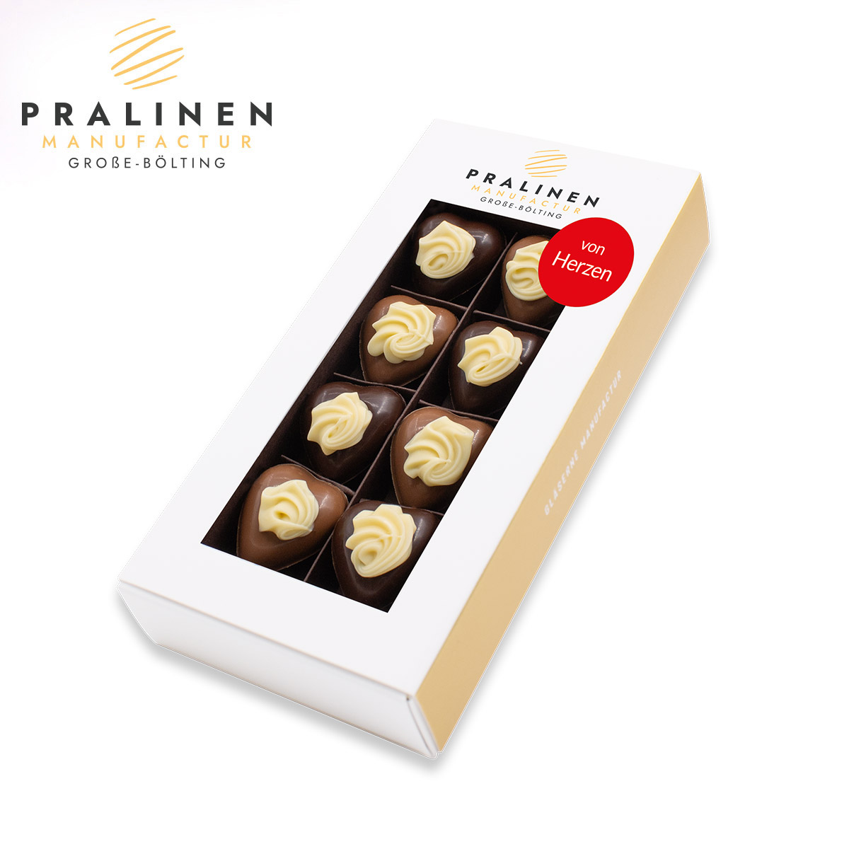 Zutaten: Pralinenherzen gefüllt mit feiner Creme aus Macadamianüssen, umhüllt mit Vollmilchschokolade und Zartbitterschokolade.